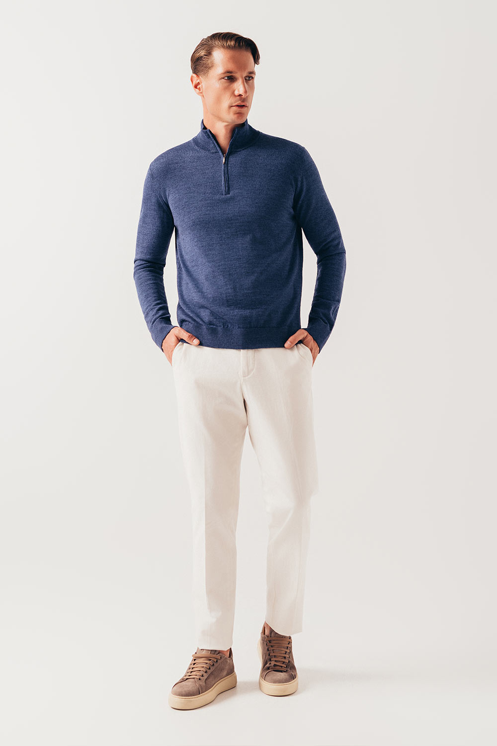 Garinello half zip džemper je neizostavan deo vašeg garderobera. Izrađen od ekstra fine merino vune i akrila. Praktičan za kombinovanje. Odlično se uklapa uz majicu, košulju, pantalone ili farmerke. Pogodan za svaku priliku. Sitne rebraste ramfle na rukavima i donjem delu. YKK rajsferšlus.