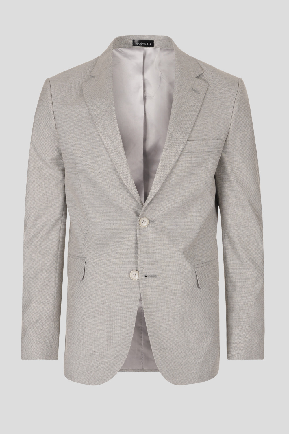 Garinello lagano odelo klasičanog kroja, odmerenih i elegantnih linija koje nikad neće gubiti na aktuelnosti. Jednoredno kopčanje sa dva dugmeta, proštepani reveri, paspulirani džep u nivou grudi, prednji džepovi na preklop, tri džepa sa unutrašnje strane i dva šlica na zadnjoj strani. Osećajte se sofisticirano i sigurno u svakoj prilici.